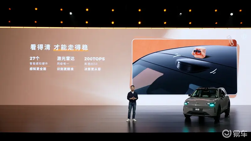 外观方面,新车继续延续了零跑的家族式设计语言,极具辨识度。新车前脸配备了三段式大灯组,造型比较明显。此外,新车还配备了激光雷达,拥有27个智能感知硬件,搭载SA8650辅助驾驶芯片,算力达到200TOPS。