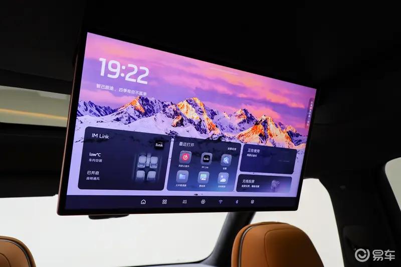 第二排配备21.5英寸吸顶娱乐屏,采用真4K高清分辨率,支持系统级IMLink互联控车功能。二排座椅支持靠背角度电动调节,配备折叠小桌板与可伸缩腿托。后备厢标准容积可容纳6个28英寸行李箱,内部宽度可横置高尔夫球包,婴儿车或露营车无需折叠即可放入。全车储物空间共计9处,包括二排座椅下方的9.2L隐藏式抽屉。