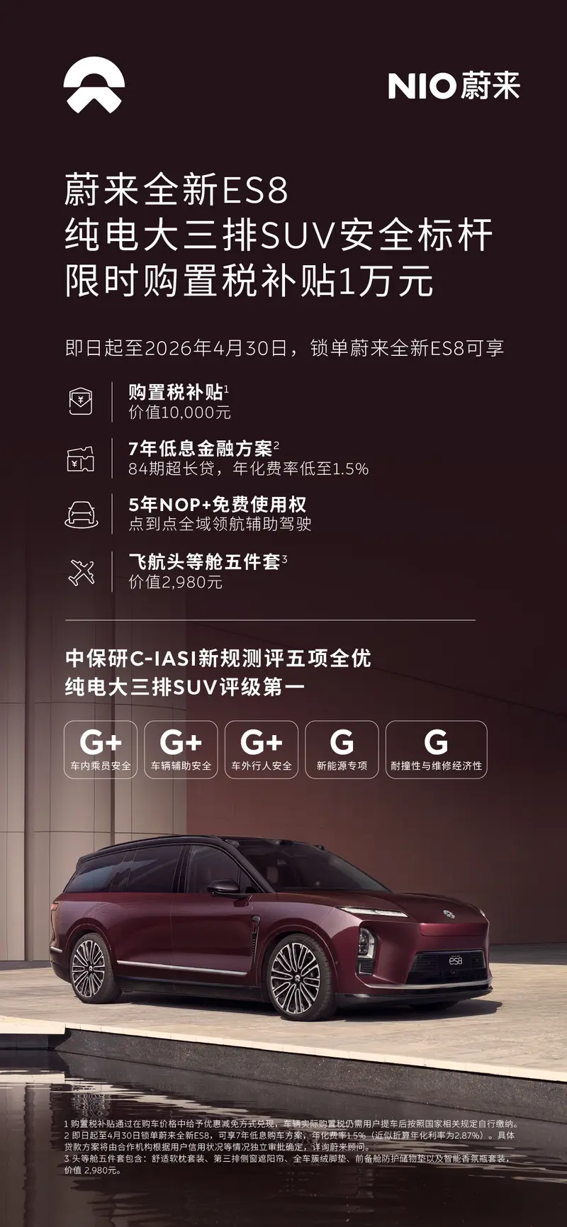 易车讯 4月1日,蔚来官方宣布继续推出全新ES8专属限时旗舰礼遇,即日起至4月30日,锁单可享限时购置税补贴10,000元,5年全域领航辅助 NOP+免费使用权,飞航头等舱五件套,并提供7年84期低息金融购车方案。