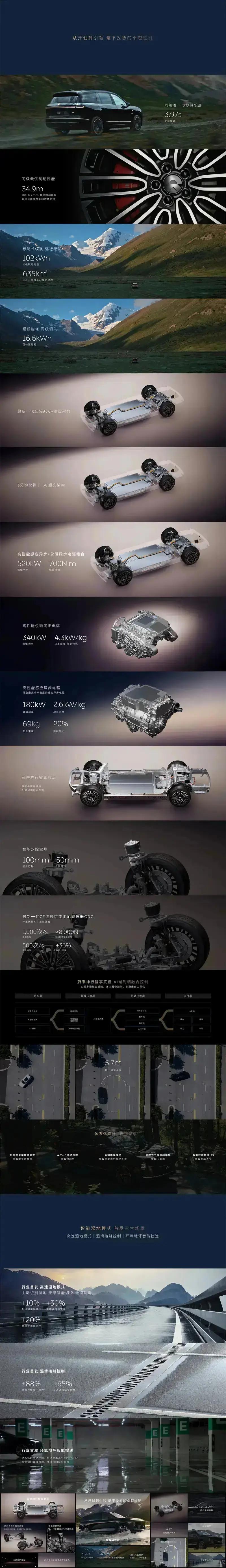 动力方面,全新蔚来ES8搭载双电机系统,前电机最大功率180千瓦,后电机最大功率340千瓦,综合功率520千瓦,综合扭矩700牛·米,百公里加速3.97秒。电池方面搭载102kWh电池组,CLTC纯电续航可达635公里,百公里综合电耗仅为16.6kWh。