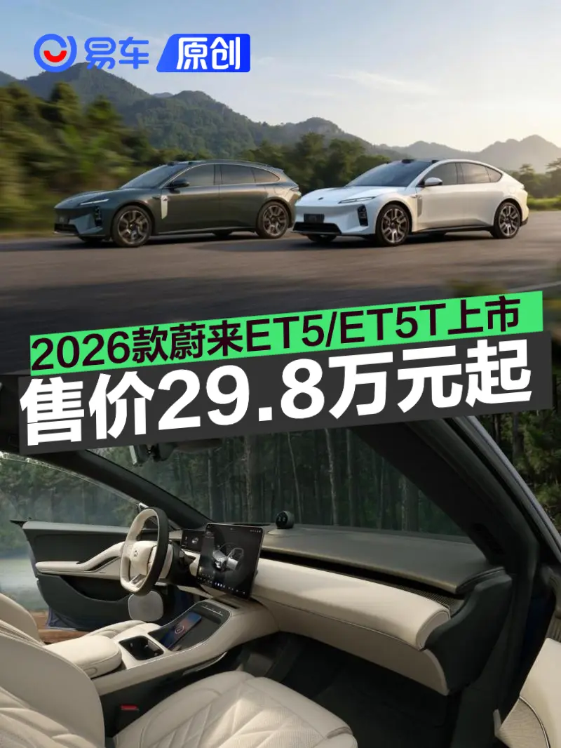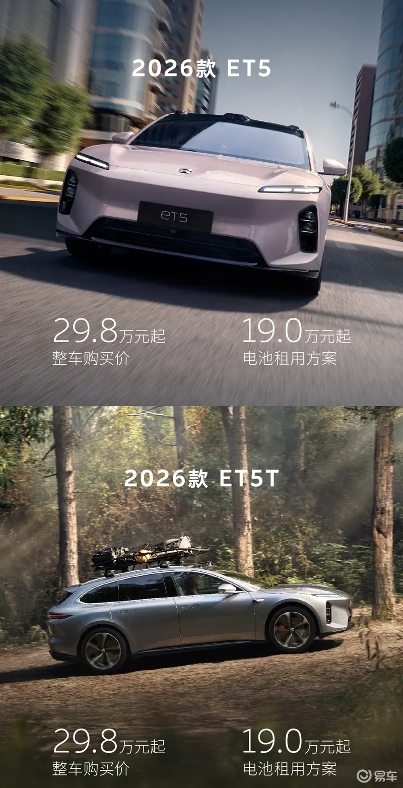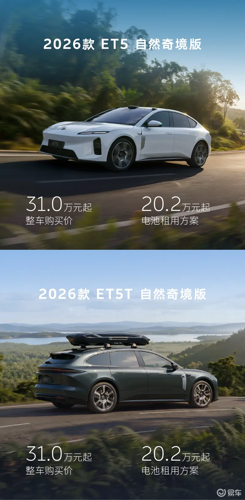 易车讯 4月2日,蔚来宣布2026款蔚来ET5/ET5T正式上市,整车购买价均为29.8万元起,电池租用方案售价均为19.0万元起。此外,蔚来还推出2026款ET5自然奇境版和2026款ET5T自然奇境版,整车购买价均为31.0万元起,电池租用方案售价均为20.2万元起。