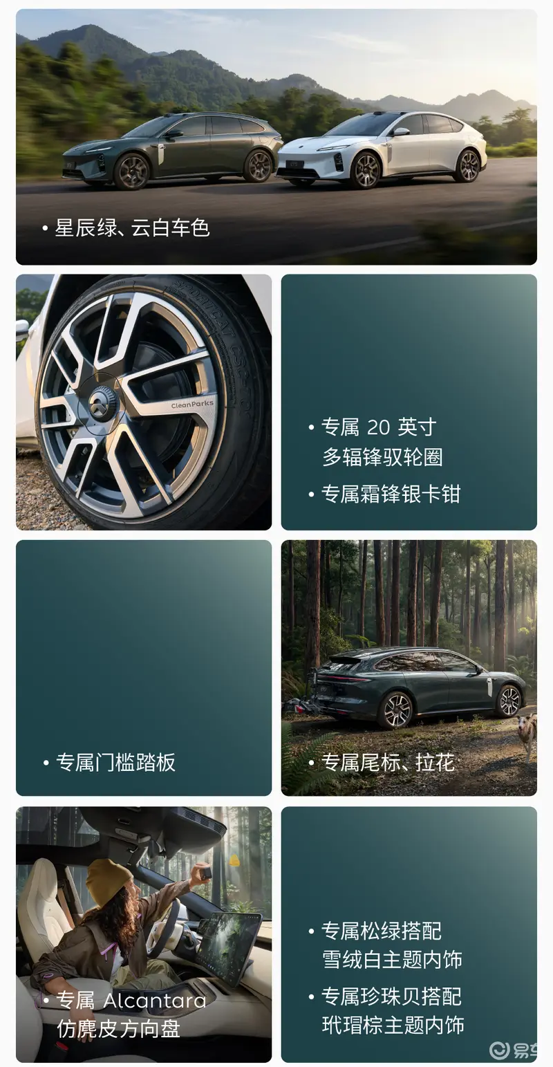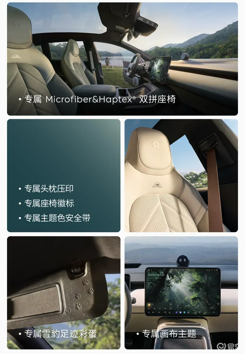 两款新增车型采用星辰绿和云白车色,配备专属20英寸多辐锋驭轮圈以及专属霜锋银卡钳。此外还配备了专属门槛踏板、尾标、拉花。内饰方面,两款新车采用专属松绿搭配雪绒白和珍珠贝搭配玳瑁棕主题内饰,搭载专属Alcantard仿麂皮方向盘,采用专属Microfiber&Haptex双拼座椅,拥有专属头枕压印、座椅徽标以及主题色安全带,此外还有专属雪豹足迹彩蛋以及专属画布主题。