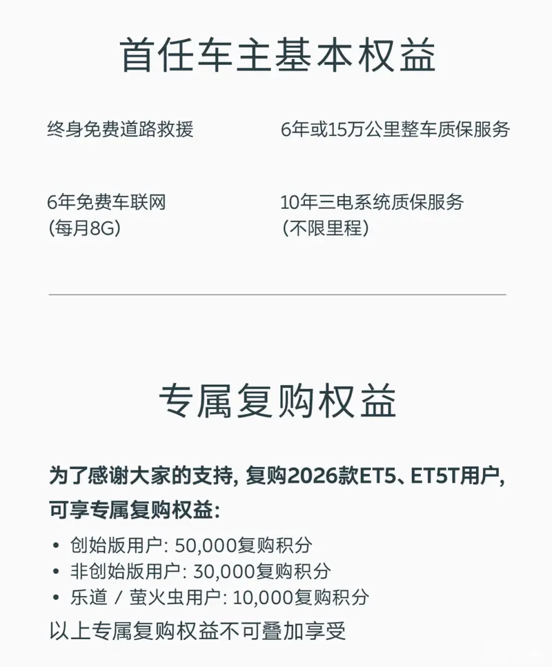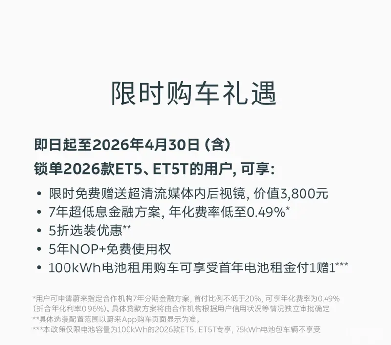 官方还推出限时购车礼遇,即日起至2026年4月30日(含),锁单2026款ET5、ET5T的用户,可享限时免费赠送价值3800元超清流媒体内后视镜;7年超低息金融方案,年化费率低至0.49%;5折选装优惠;5年NOP+免费使用权;100kWh电池租用购车可享受首年电池租金付1赠1。购买2026款ET5、ET5T自然奇境版的用户还可额外加享价值466元的NIO Life 自然奇境版专属提车礼。