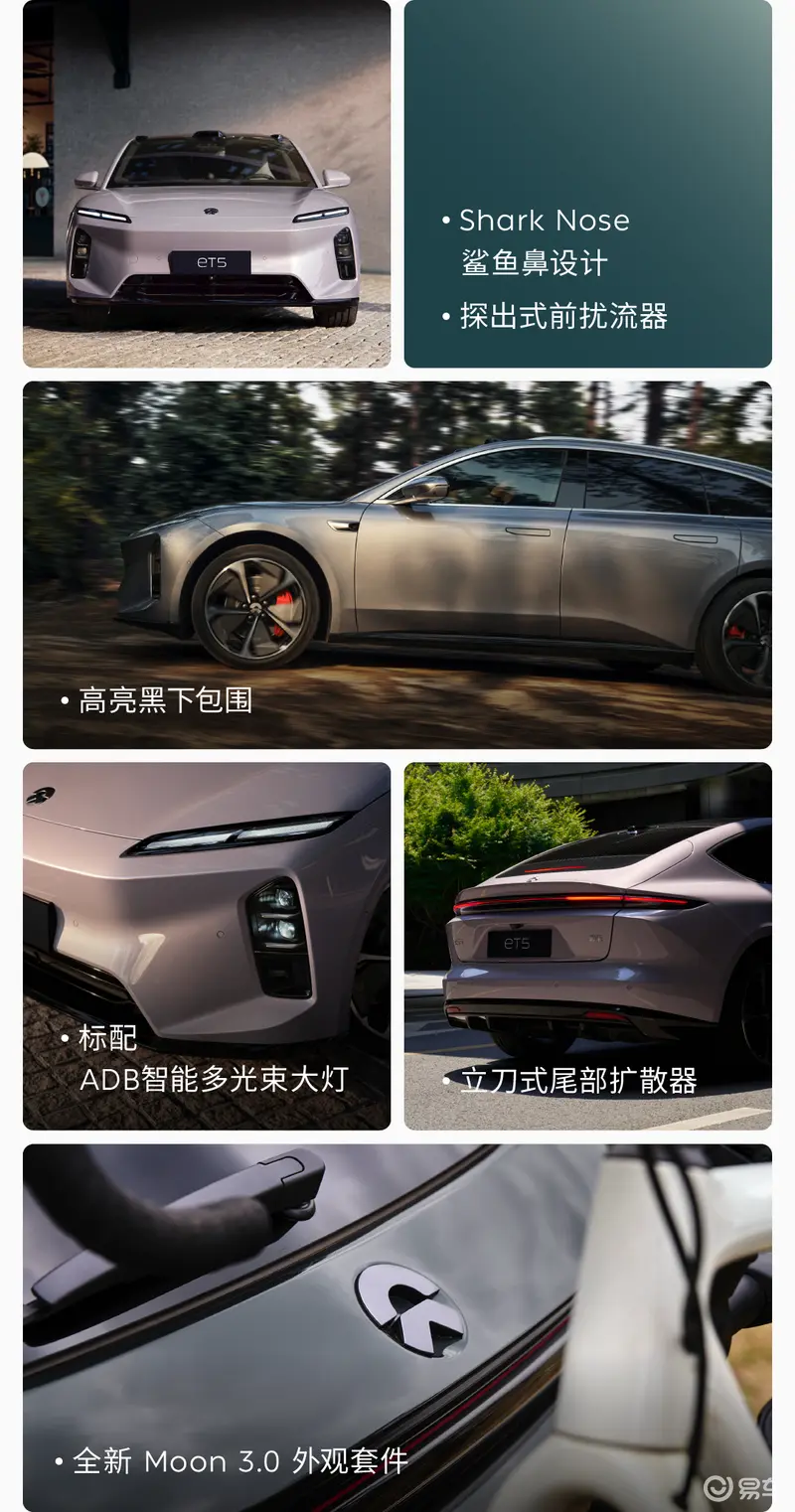2026款蔚来ET5/ET5T采用全新Moon 3.0外观套件,前脸采用Shark Nose鲨鱼鼻设计,搭载探出式前扰流器,标配ADB智能多光束大灯。此外,新车还搭载高亮黑下包围以及立刀式尾部扩散器。