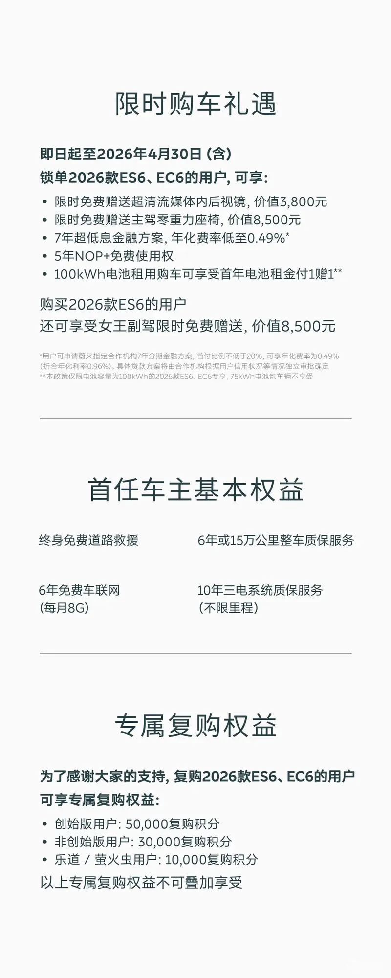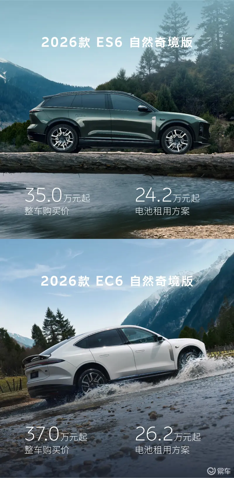 易车讯 4月2日,2026款蔚来ES6/EC6正式上市,其中2026款蔚来ES6整车购买价33.8万元起,电池租用方案价为23.0万元起;2026款蔚来EC6整车购买价35.8万元起,电池租用方案价为25.0万元起。此外官方还推出2026款ES6自然奇境版和2026款EC6自然奇境版,其中2026款ES6自然奇境版整车购买价35.0万元起,电池租用方案价为24.2万元起;2026款EC6自然奇境版整车购买价37.0万元起,电池租用方案价26.2万元起。
