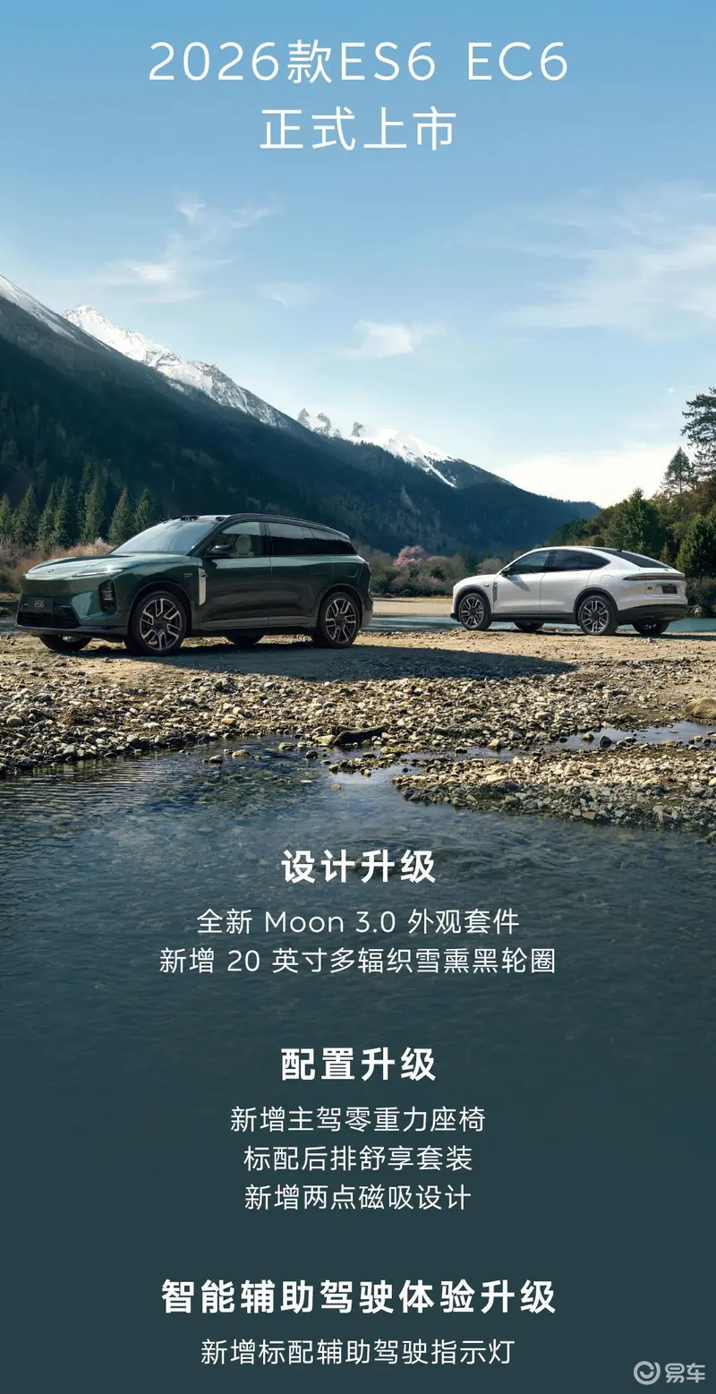 2026款蔚来ES6、EC6致力于打造全员舒享座舱,新增主驾零重力座椅,ES6限时赠送女王副驾,实现前排双零重力布局,全系标配后排舒享套装,实现前后排加热、通风、按摩功能全覆盖;外观全新升级的Moon 3.0外观套件与20英寸多辐织雪熏黑轮圈,质感更高级;辅助驾驶指示灯的加入,让交互更清晰、行车更显从容。