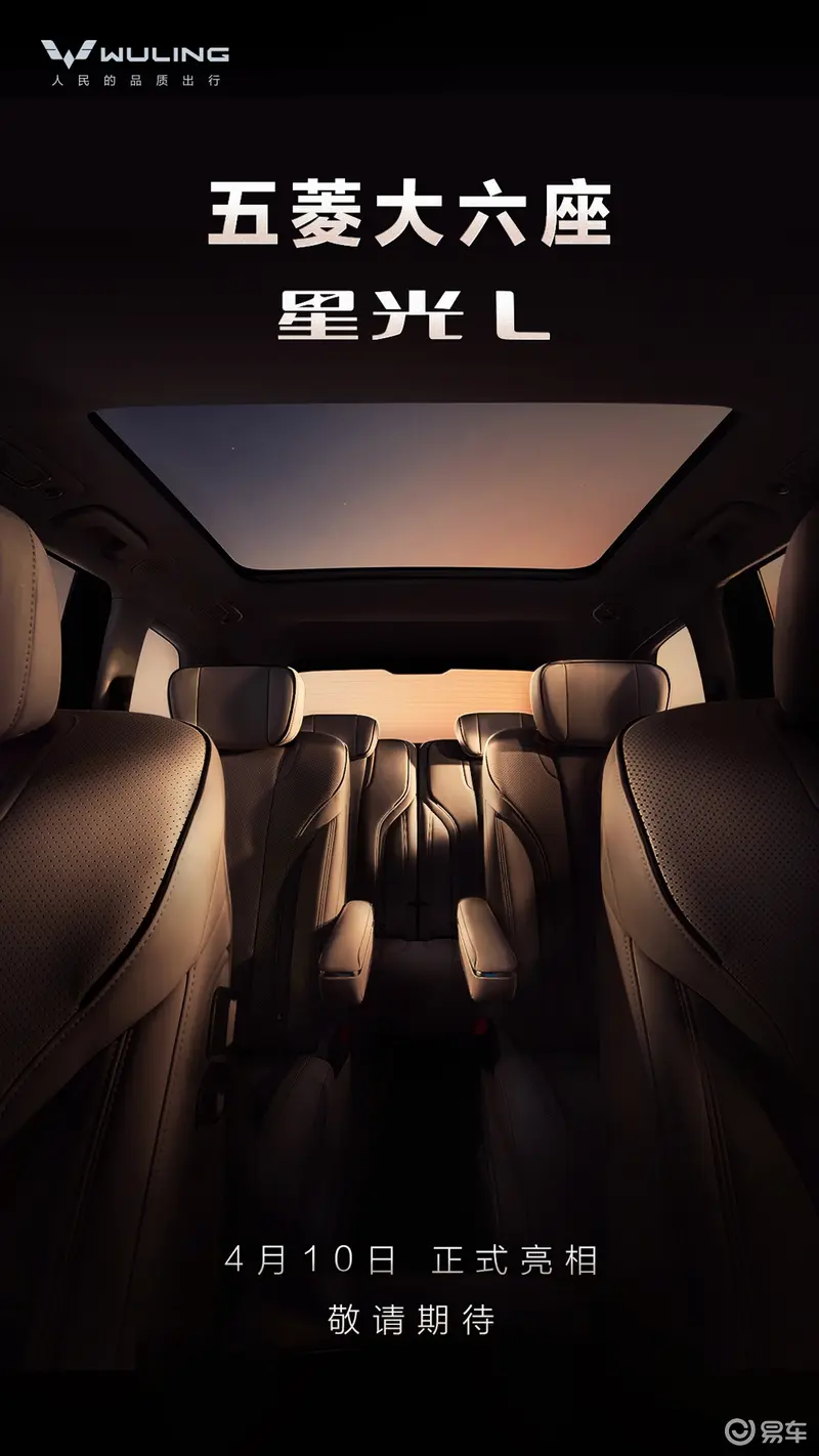 易车讯 4月2日,五菱宣布旗下大六座SUV五菱星光L将于4月10日亮相。该车采用五菱最新的“凌空美学”设计风格,座椅方面提供五座和六座两种选择,动力方面则搭载1.5L插混系统。