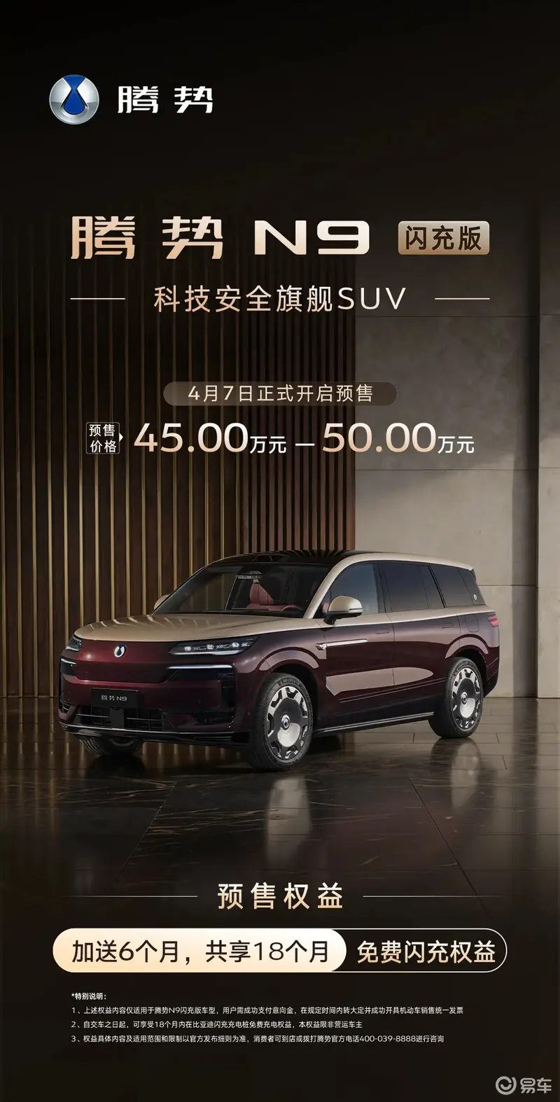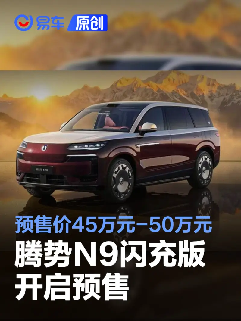 易车讯 今日,腾势N9闪充版开启预售,预售价45万元-50万元。新车标配第二代刀片电池、纯电续航420km,可享受18个月免费闪充权益。