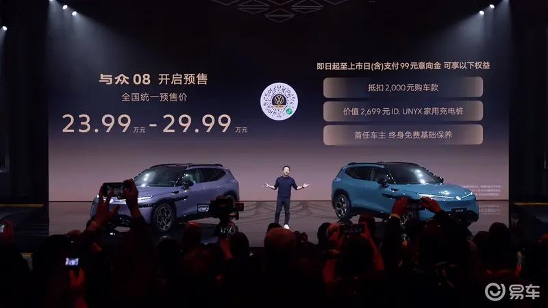 年3月26日(含)至与众08上市日(含),支付99元意向金可享99元意向金抵扣2000元购车款、价值2699元ID.UNYX家用充电桩以及首任车主终身免费基础保养。
