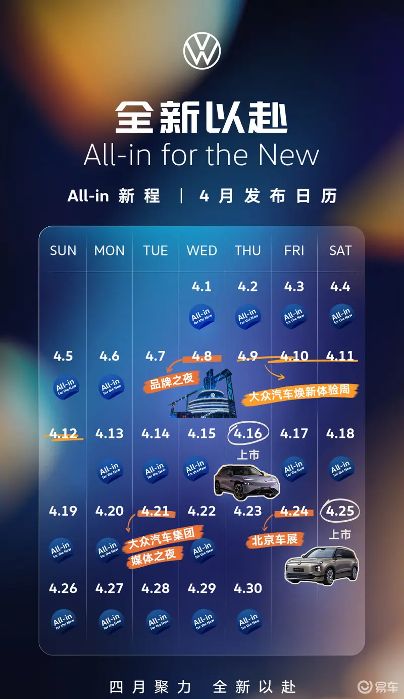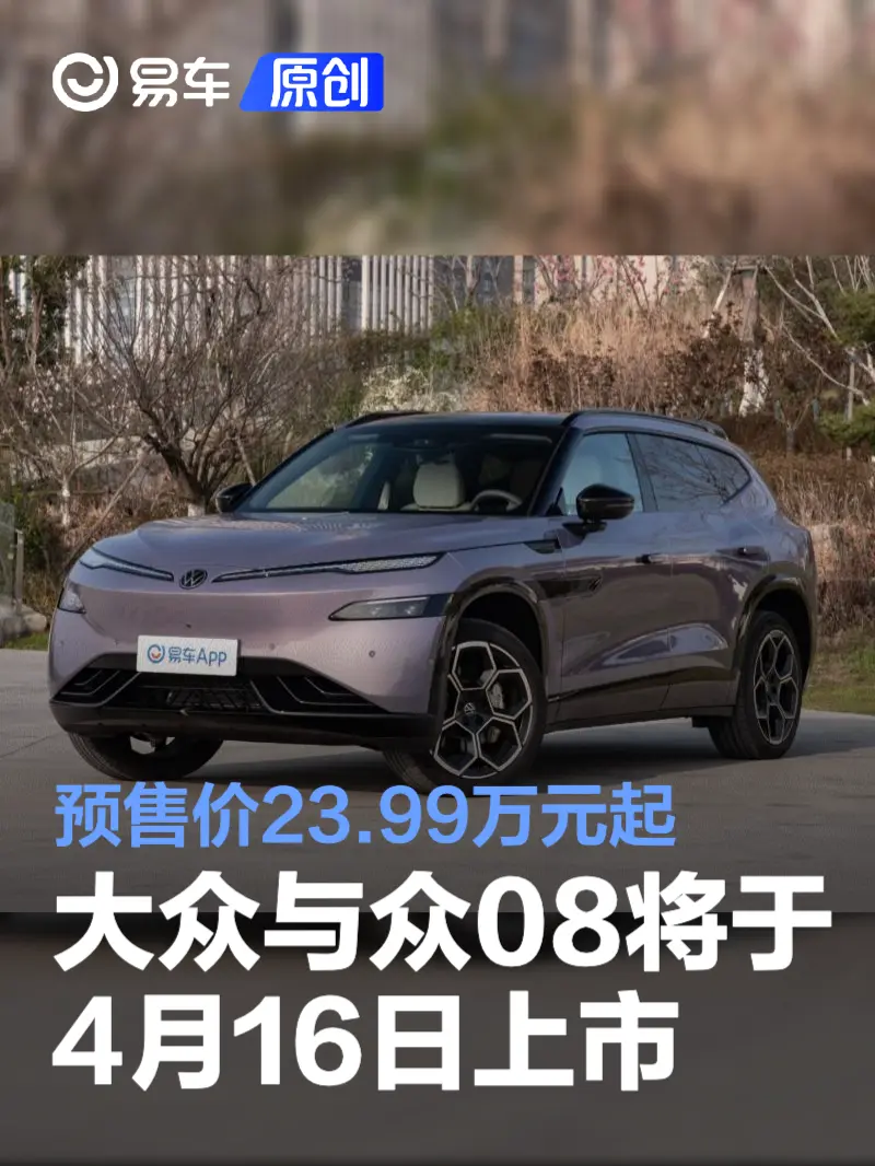 易车讯 4月7日,大众汽车乘用车品牌中国CEO齐泽凯在社交媒体上公布了大众4月份新车动态,表示大众与众08将于4月16日上市。该车已在3月26日开启预售,预售价区间23.99-29.99万元。
