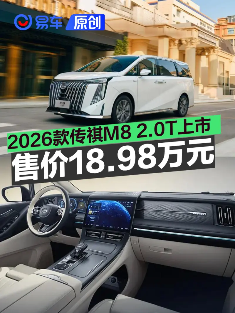 易车讯 4月8日,广汽传祺宣布2026款传祺M8新增2.0T尊享版车型,市场指导价18.98万元,政企双补价16.98万元起。新车搭载传祺高功率2.0TGDI发动机和爱信8AT变速箱动力总成。