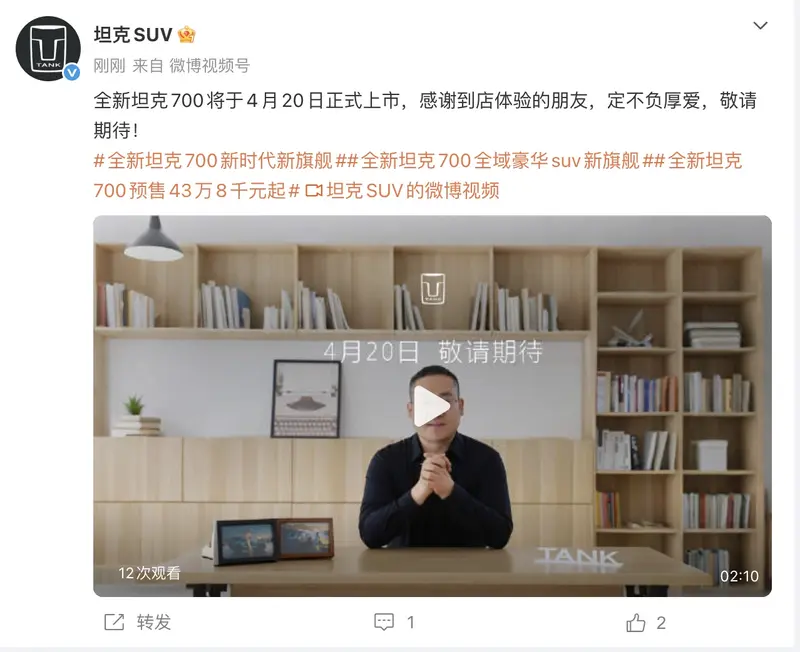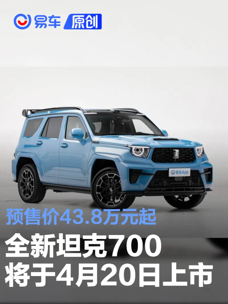 易车讯 4月8日,坦克品牌宣布全新坦克700将于4月20日上市。全新坦克700已在3月30日开启预售,预售价区间43.8-51.8万元。
