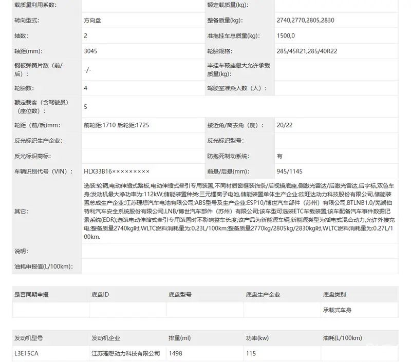 动力方面,新车依旧采用增程式动力,搭载型号为L3E15CA的1.5T理想全新自研增程器,标配理想牌72.7kWh 5C三元锂离子电池组,WLTC综合油耗6.2L/100km,WLTC纯电续航343km,预计将于今年第三季度交付。