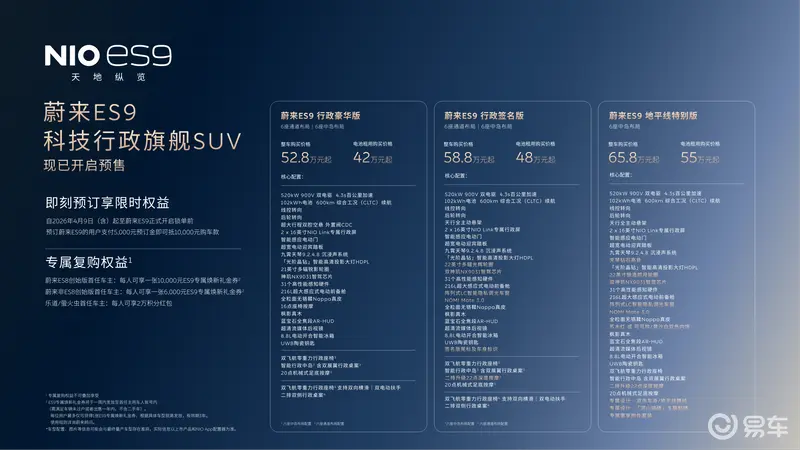 自2026年4月9日(含)起至蔚来ES9正式开启锁单前预订蔚来ES9的用户支付5000元预订金即可抵10000元购车款;蔚来ES8创始版首任车主每人可享一张10000元ES9专属焕新礼金券;蔚来非ES8创始版首任车主每人可享一张6000元ES9专属焕新礼金券;乐道/萤火虫首任车主每人可享2万积分红包。