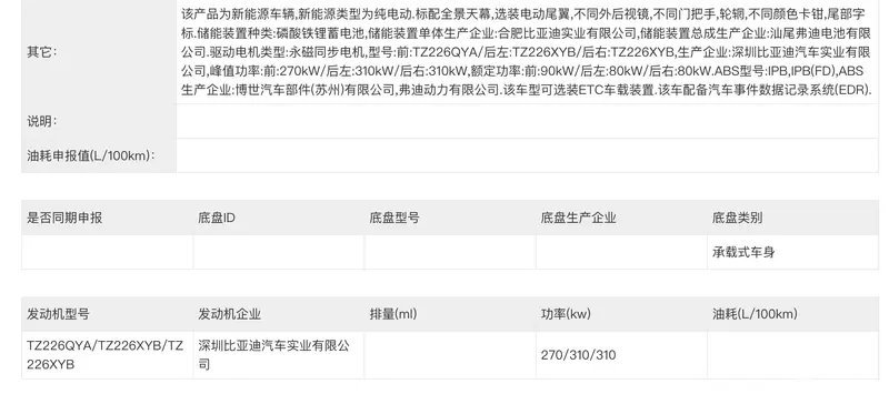 申报信息显示该车提供单电机和三电机两种动力,单电机版电机功率为370千瓦,三电机版电机总功率达到890千瓦。电池和充电方面,该车很可能搭载比亚迪刚刚发布的第二代刀片电池以及最新的闪充技术。