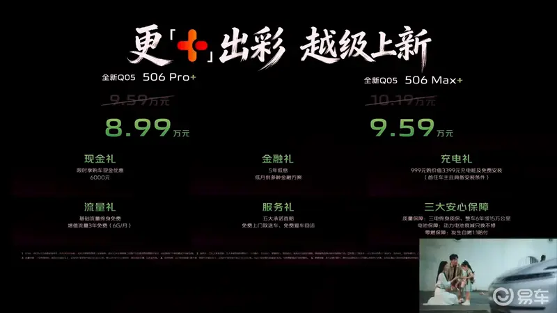 购买全新Q05新车型限时享购车现金优惠6000元;5年低息、低月供多种金融方案;999元购价值3399元充电桩及免费安装(首任车主且具备安装条件);基础流量终身免费,增值流量3年免费(6G/月);五大承诺直赔、免费上门取送车、免费爱车回运;质量保障:三电终身质保、整车6年或15万公里;电池保障:动力电池衰减只换不修;零燃保障:发生自燃1:1赔付。