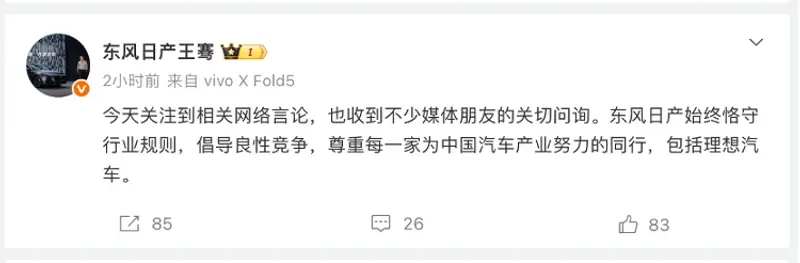 李想发文不久后,被卷入风波的东风日产汽车销售有限公司新能源品牌总经理王骞,在个人微博进行了回应,今天关注到相关网络言论,也收到不少媒体朋友的关切问询。东风日产始终恪守行业规则,倡导良性竞争,尊重每一家为中国汽车产业努力的同行,包括理想汽车。