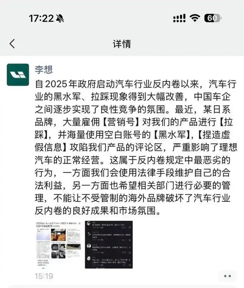 4月11日下午,理想汽车创始人李想朋友圈发文,某日系品牌大量雇佣“营销号”“黑水军”对理想的产品进行拉踩,严重影响理想汽车的正常经营,并怒斥“这属于反内卷规定中最恶劣的行为”。