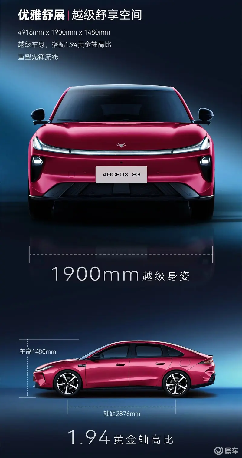 易车讯 4月15日,极狐汽车正式发布了一组极狐S3车型官图。极狐S3采用超级光影美学设计语言,提供纯电、增程、换电多个动力选择。极狐汽车表示,极狐S3将于北京车展开启预售。