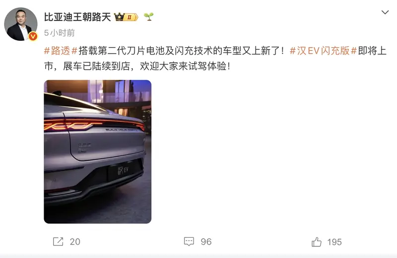 易车讯 4月15日,比亚迪王朝网销售事业部总经理路天在社交媒体上宣布,比亚迪汉EV闪充版即将上市。目前该车已经陆续到店,易车编辑也拍到该车的实车图。