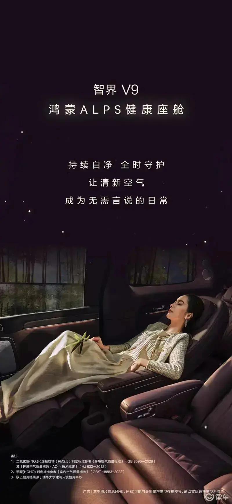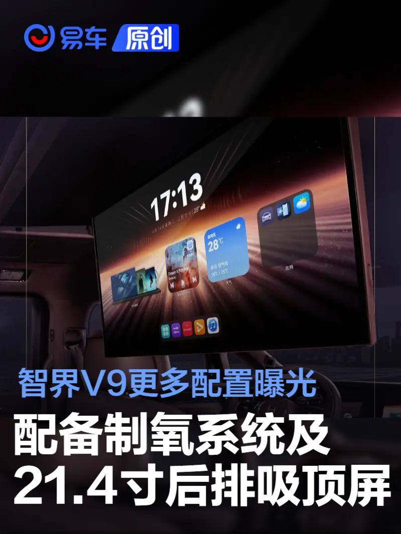 易车讯 日前,鸿蒙智行官方发布了智界V9更多配置信息,新车配备车载制氧系统、恒冷冰箱以及21.4英寸后排吸顶屏等配置。智界V9将于4月22日举办的鸿蒙智行春季新品发布会上开启预订,展车将于4月下旬到店。