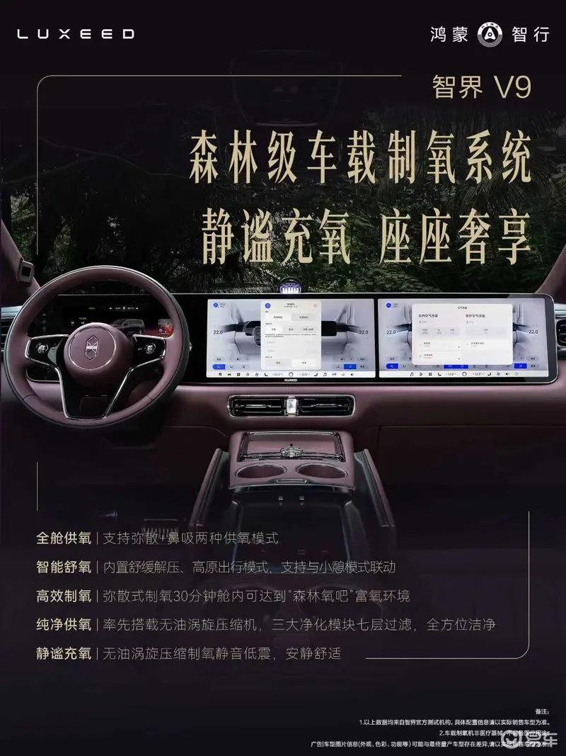 从公布的配置来看,智界V9森林级车载制氧系统采用全舱供氧,支持弥散+鼻吸两种供氧模式;智能舒氧内置舒缓解压、高原出行模式,支持与小憩模式联动;弥散式制氧30分钟舱内可达到“森林氧吧”富氧环境;并搭载无油涡旋压缩机,三大净化模块七层过滤,全方位洁净;无油涡旋压缩制氧可实现静音低震,安静舒适。