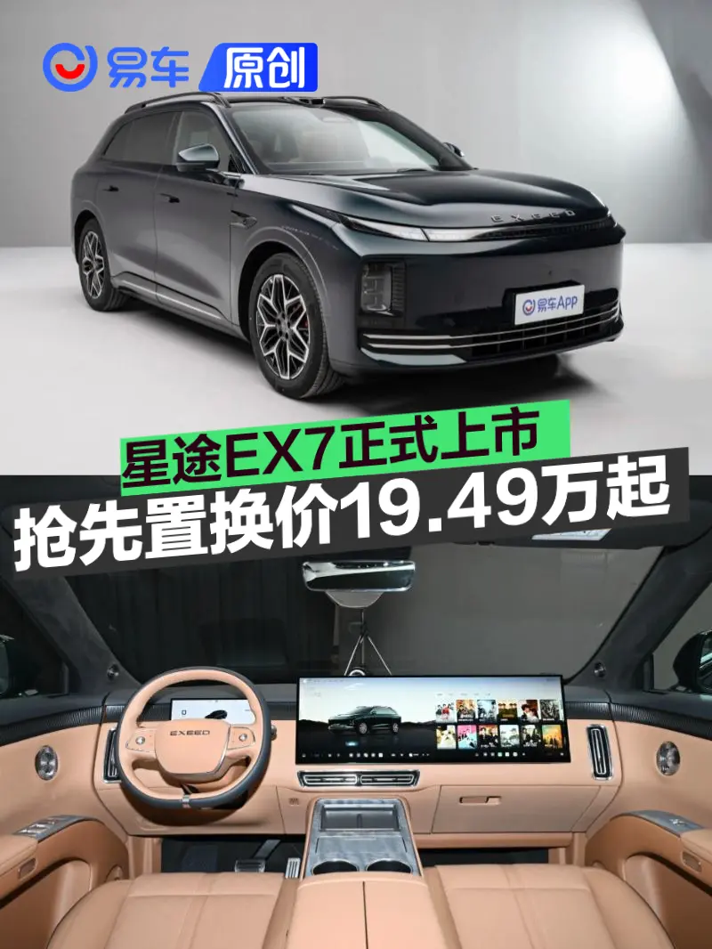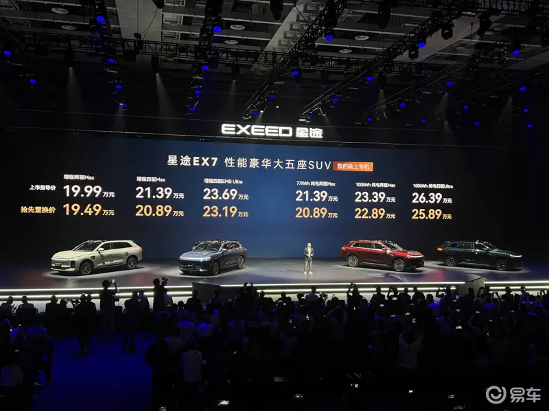易车讯 4月19日,星途汽车全新中大型SUV星途EX7正式上市,新车提供纯电和增程两种动力选择,共推出6款不同配置的车型,官方指导价区间19.99-26.39万元,抢先置换价区间19.49-25.89万元。