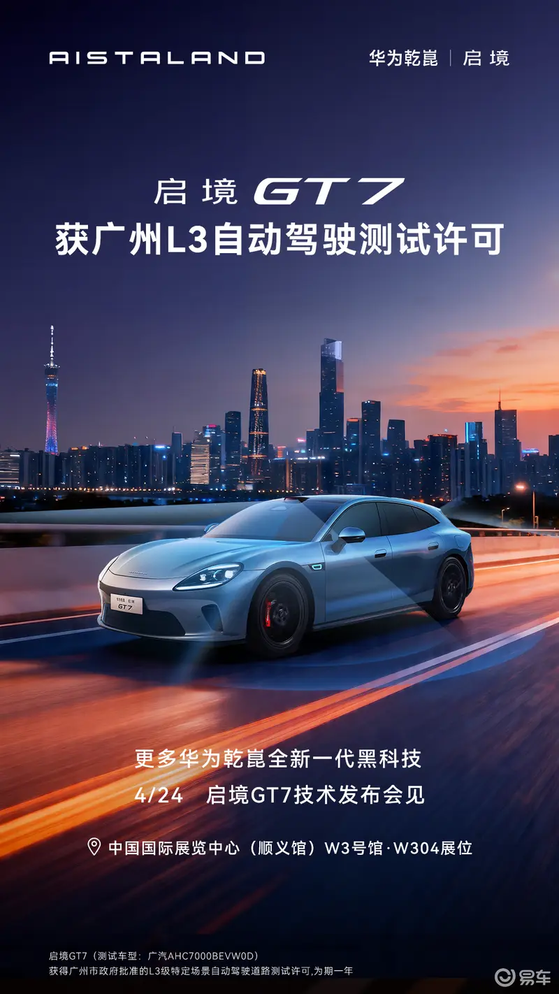 易车讯 近日,广汽与华为乾崑联合打造的启境GT7(测试车型:广汽AHC7000BEVW0D),正式获得L3级有条件自动驾驶道路测试许可,将在广州地区规定路段开展特定场景道路实测。新车搭载量产最高规格896线激光雷达与一体双焦视觉系统,可同时覆盖广角与长焦感知,硬件水准位居行业前列。本次获批后,启境GT7会在从埔高速公路一期、南沙港快速路等10条高快速公路开展为期一年的L3有条件自动驾驶测试。