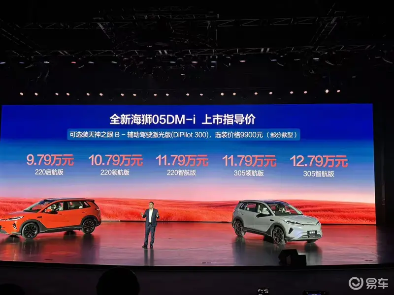 全新海狮05DM-i则升级提供CLTC纯电续航220km和305km两种版本可选,满油满电综合续航最高可达2105km,NEDC百公里亏电油耗低至3.1L。