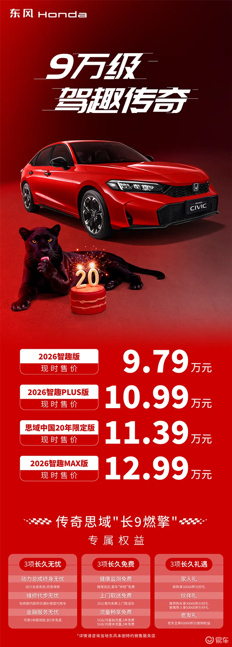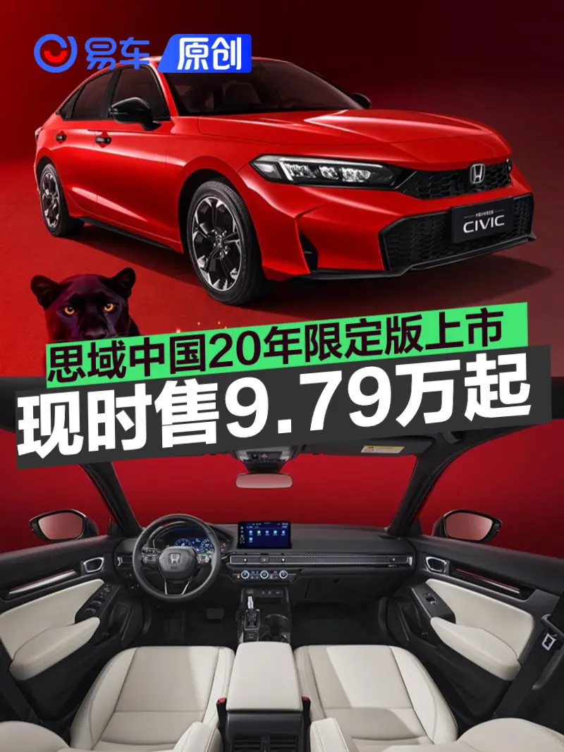 易车讯 4月22日,东风本田宣布思域中国20年限定版正式上市,共推出4款车型,现时售价区间9.79-12.99万元。官方表示,该车也将亮相4月24日开幕的北京车展。