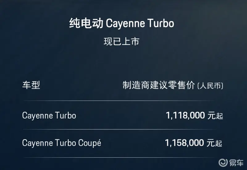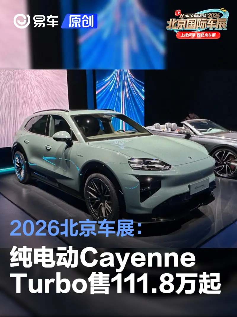 易车讯 在日前开幕的北京车展上,保时捷纯电动Cayenne Turbo正式国内亮相并公布售价,包含两款车型,售价区间111.8-115.8万元。该车曾与2025年11月海外发布,搭载双电机四驱系统,百公里加速仅需2.5秒。