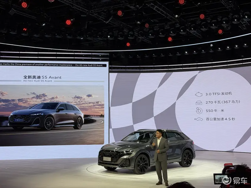动力部分,其搭载4.0T V8双涡轮增压发动机,最大功率500马力,峰值扭矩770N・m,匹配8速Tiptronic变速箱与quattro四驱系统,官方0-100km/h加速时间仅4.1秒。
