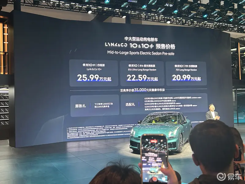 易车讯 在今日开幕的北京车展上,领克10和领克10+正式开启预售,预售价20.99万元起。新车定位为中大型纯电轿车,配备了900V高压架构,并推出多种动力版本供消费者选择。