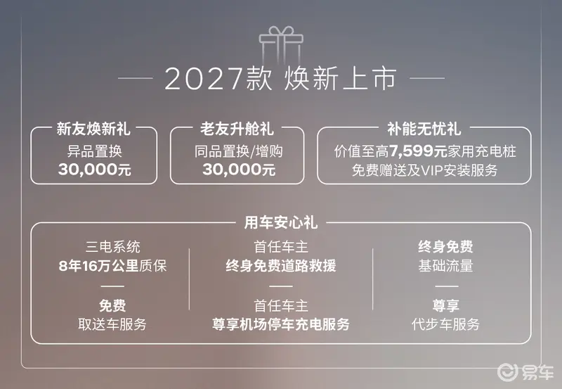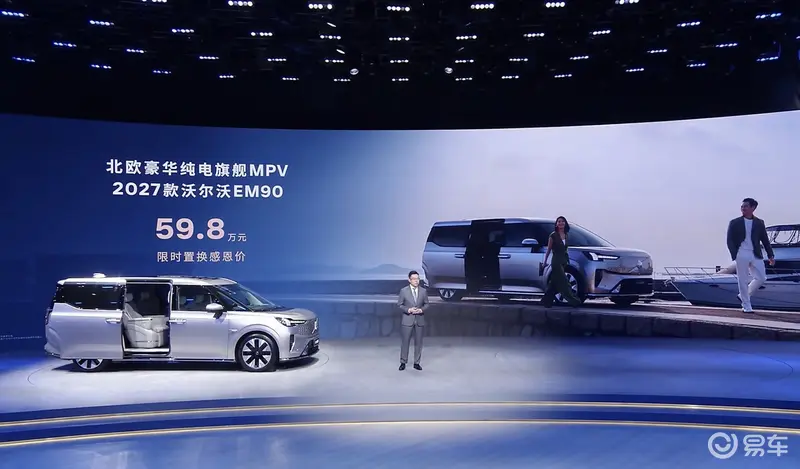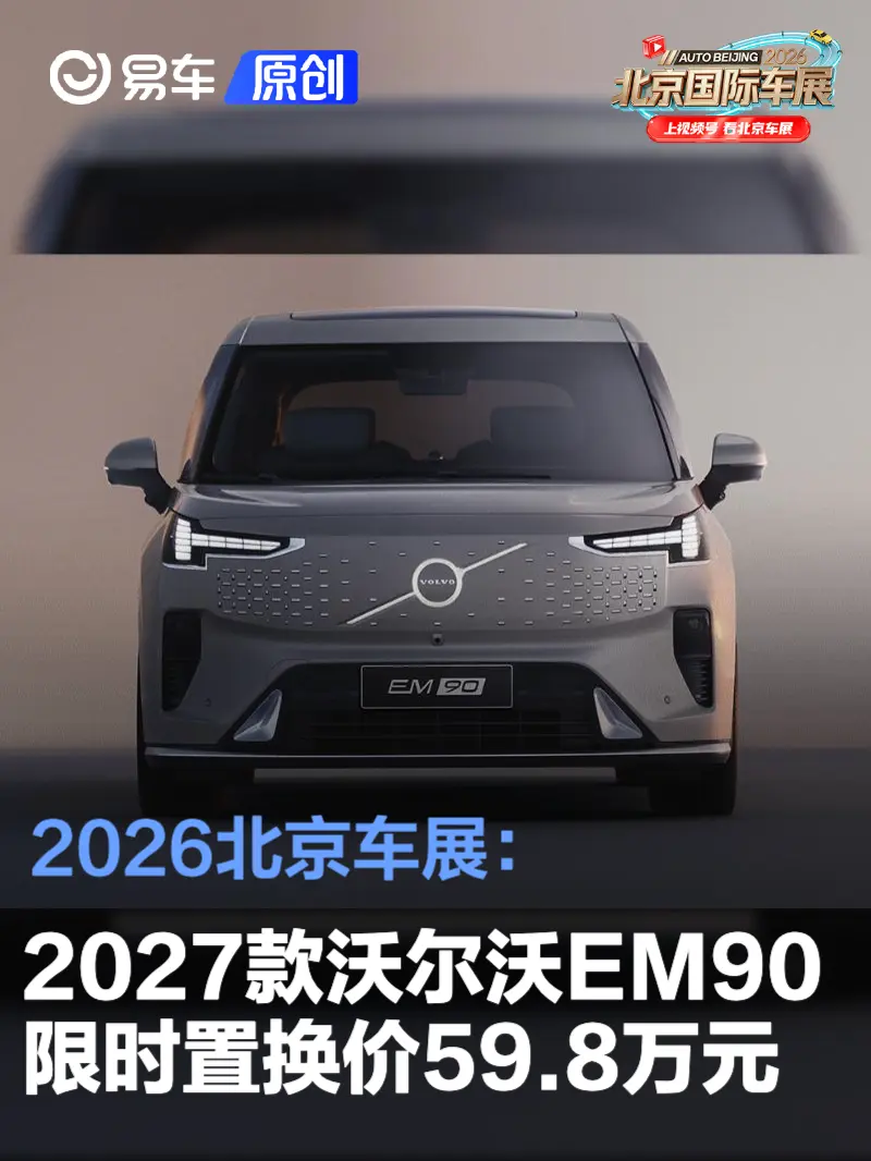 易车讯 在今日开幕北京车展上,2027款沃尔沃EM90正式上市,限时置换感恩价59.8万元。同时新车还推出多重购车权益,包含异品置换补贴30000元、同品置换/增购补贴30000元;免费赠送价值至高7599元家用充电桩及VIP安装服务、三电系统8年16万公里质保、首任车主终身免费道路救援、终身免费基础流量等。
