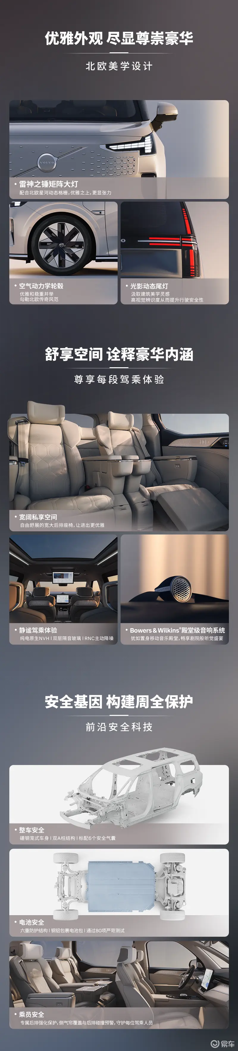 动力方面,新车搭载前后双电机,配备116kW电池,CLTC综合续航里程738km。同时,EM90配备了先进的电池安全技术,采用坚固钢铝材质结构,提升了电池在真实碰撞场景中的安全稳定性。