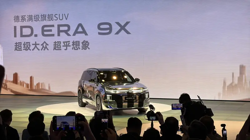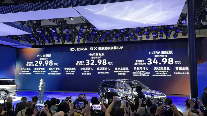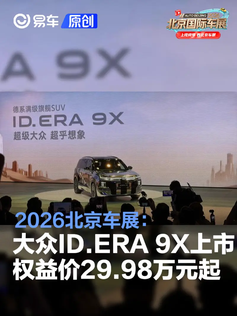 易车讯 在2026北京车展上,上汽大众ID. ERA 9X正式上市,共推出3款车型,上市权益价29.98-34.98万元。大众ID. ERA 9X采用全新的设计语言,轴距达到3070mm。内饰方面配备了15.6英寸超高清中控主副驾双联屏以及21.4英寸后排娱乐屏,科技感十足。动力方面采用增程系统,CLTC纯电续航超400km。官方表示,新车上市半小时锁单10259台。