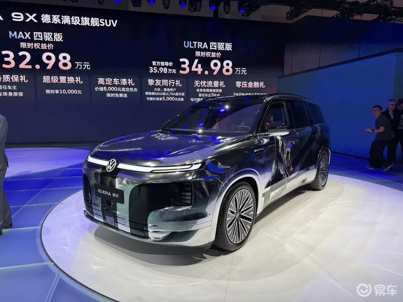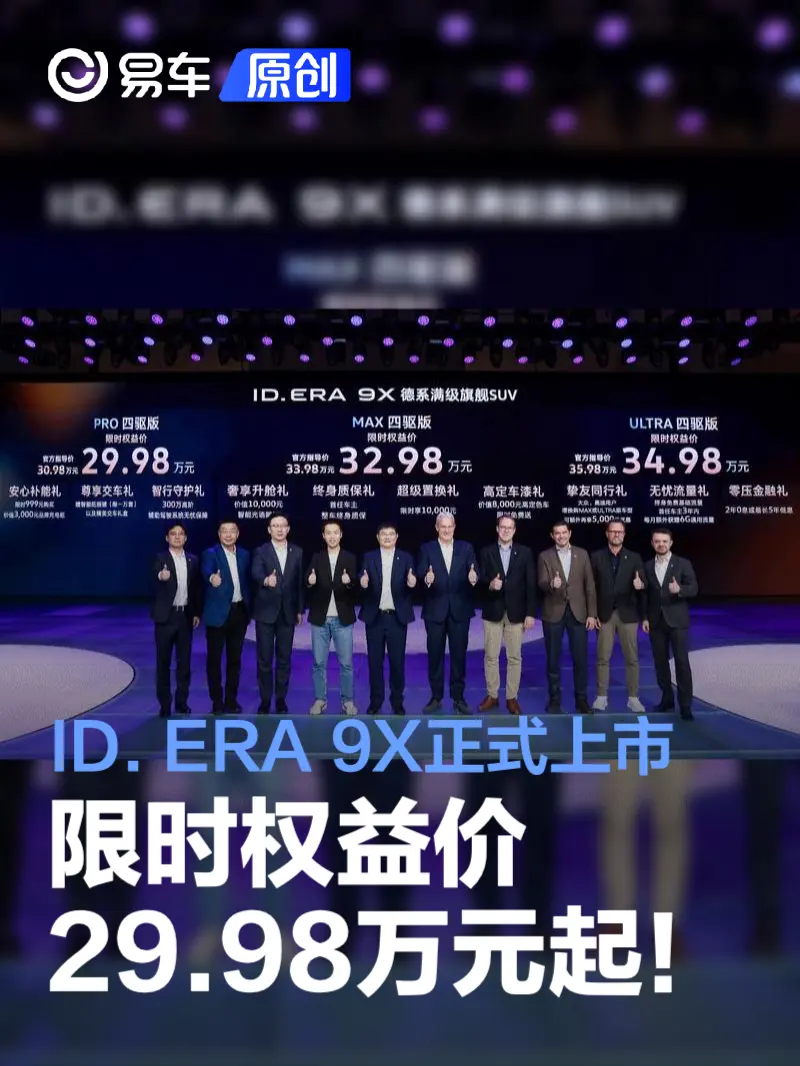 易车讯 在2026北京车展现场,上汽大众ID. ERA 9X正式上市。新车共推出Pro、Max、Ultra三款四驱版车型,官方指导价为30.98万元-35.98万元,限时权益价29.98万元-34.98万元(4月25日-5月31日,详情请洽当地经销商),同步推出多重上市礼遇。作为上汽大众全新新能源序列ID. ERA的开山力作,同时也是大众汽车全新以赴打造的首款9系旗舰车型,ID. ERA 9X实现德系精湛造车工艺与中国前沿智能科技深度融合,并携手大众汽车焕新代言人辛芷蕾,生动诠释品牌“进取、可靠、贴心”的精神内核,以满级实力为用户带来超越期待的全场景旗舰出行体验。