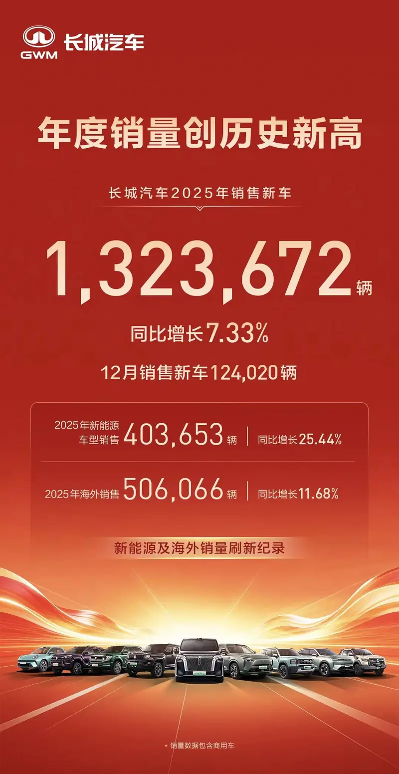 在营收增长的背后,长城汽车2025年在销量和技术布局上取得多项突破。长城汽车2025年全年销售新车132.37万辆,同比增长7.33%,再创历史新高。其中,新能源车型销售40.37万辆,同比增长25.44%,刷新纪录;海外销售50.61万辆,同比增长11.68%,同样创下新高。