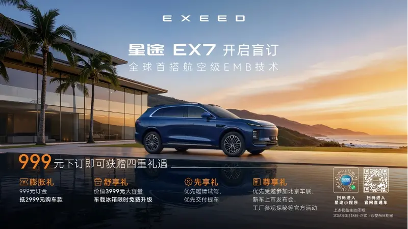 3月18日晚的奇瑞电池之夜现场,星途EX7正式开启盲定,消费者支付999元订金即可解锁膨胀礼、舒享礼、先享礼、尊享礼四重专属权益,其中包括999元订金抵2999元购车款等。