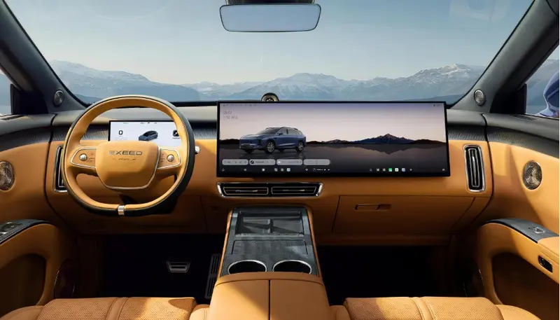 EX7采用星途最新家族化设计语言,前脸配备分体式大灯组,还采用了更具未来科技感的星际美学设计灵感,内饰上则主打简约科技风,中控台配备30 英寸一体式液晶屏,搭配椭圆形双辐方向盘和液晶仪表。