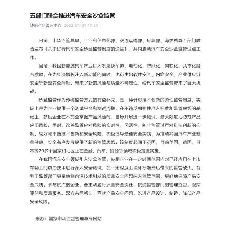 为了解决这个问题,4月初市场监管总局、工信部、交通运输部、应急部、海关总署五部门联合发布《关于试行汽车安全沙盒监管制度的通告》,共同启动汽车安全沙盒监管试点工作。