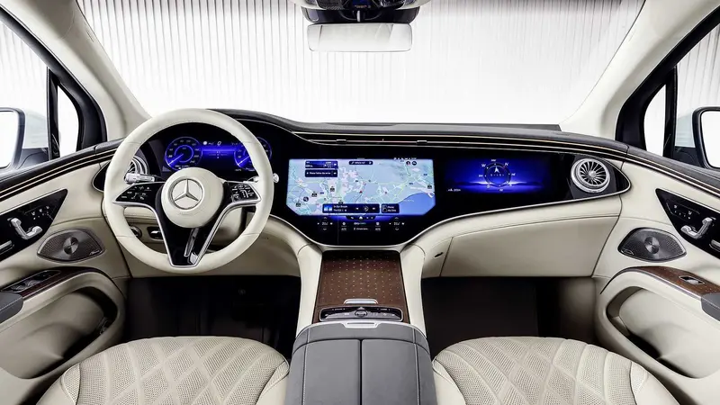 内饰汲取EQ车型最新设计理念,采用了MBUX Hyperscreen系统的OLED整块无缝衔接的曲面屏,三块触摸式的屏幕完全取代了实体按键功能,加上材质和配色的选用,质感和科技属性明显提升。