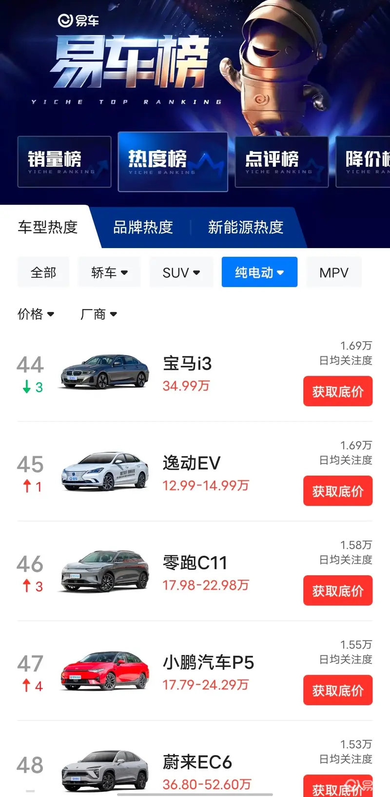 从易车App来看,华晨宝马i3日均关注度为1.69万,排名所有纯电动车热度第44位,如需了解更多,请关注易车App。