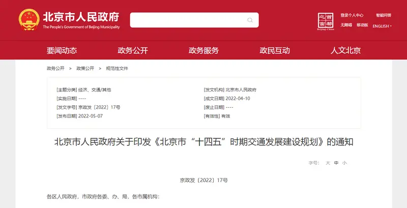 易车讯 日前,从北京市人民政府获悉,《北京市“十四五”时期交通发展建设规划》已正式发布,作为全面落实《交通强国建设纲要》的第一个五年规划,其明确了“十四五”时期北京交通发展建设的总体要求、具体指标和主要任务,是指导“十四五”时期北京交通发展建设的行动纲领。