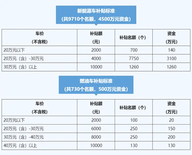 本次汽车购车消费补贴采取定额定量发放的方式,总额原则上不超过5000万元。其中新能源汽车4500万元,名额9710个;燃油汽车500万元,名额730个。新能源汽车,30万元(含)以上补贴名额1260个;20万元(含)—30万元补贴名额7750个;20万元以下补贴名额700个。燃油汽车,40万元(含)以上补贴名额130个;30万元(含)—40万元补贴名额250个;20万元(含)—30万元补贴名额250个;20万元以下补贴名额100个。本次补贴先到先得,领完即止。