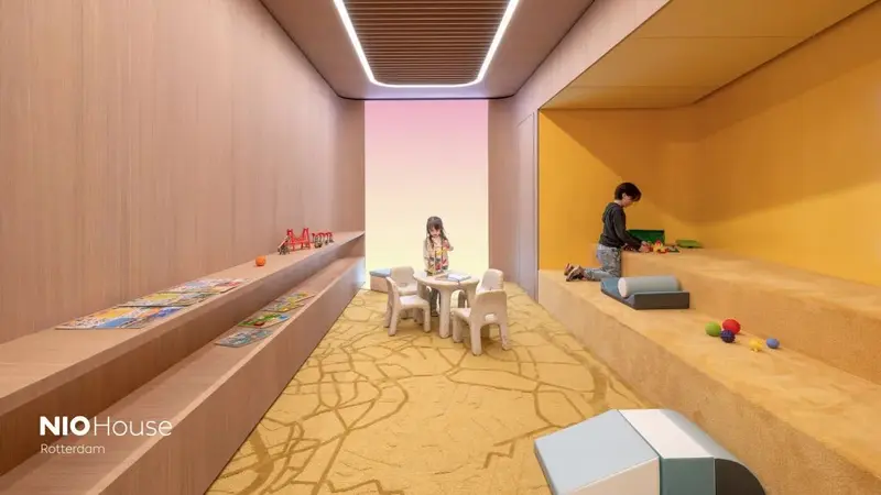 这一次 ,在我们的蔚来中心|荷兰鹿特丹设计过程中,Gallery区域与Club区域之间通过天花板的灯光颜色渐变过渡,没有明显区分间隔,从而营造出开放亲和的氛围。在作为用户专属活动区域,一张木质长桌映入眼帘,大家可以在这里相互交流,空间也有一定的灵活性,在这个区域还可以举办丰富的用户活动。