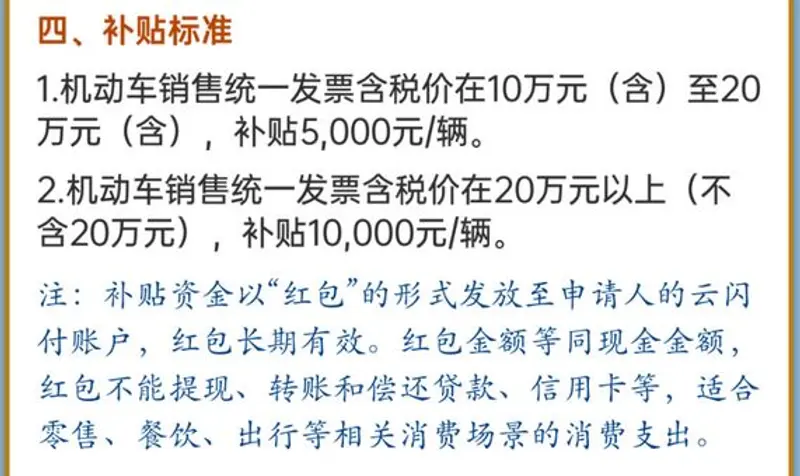 值得注意的是,车辆使用性质应为“非营运”;购置机动车销售统一发票价格在10万元以内的新车,无补贴。