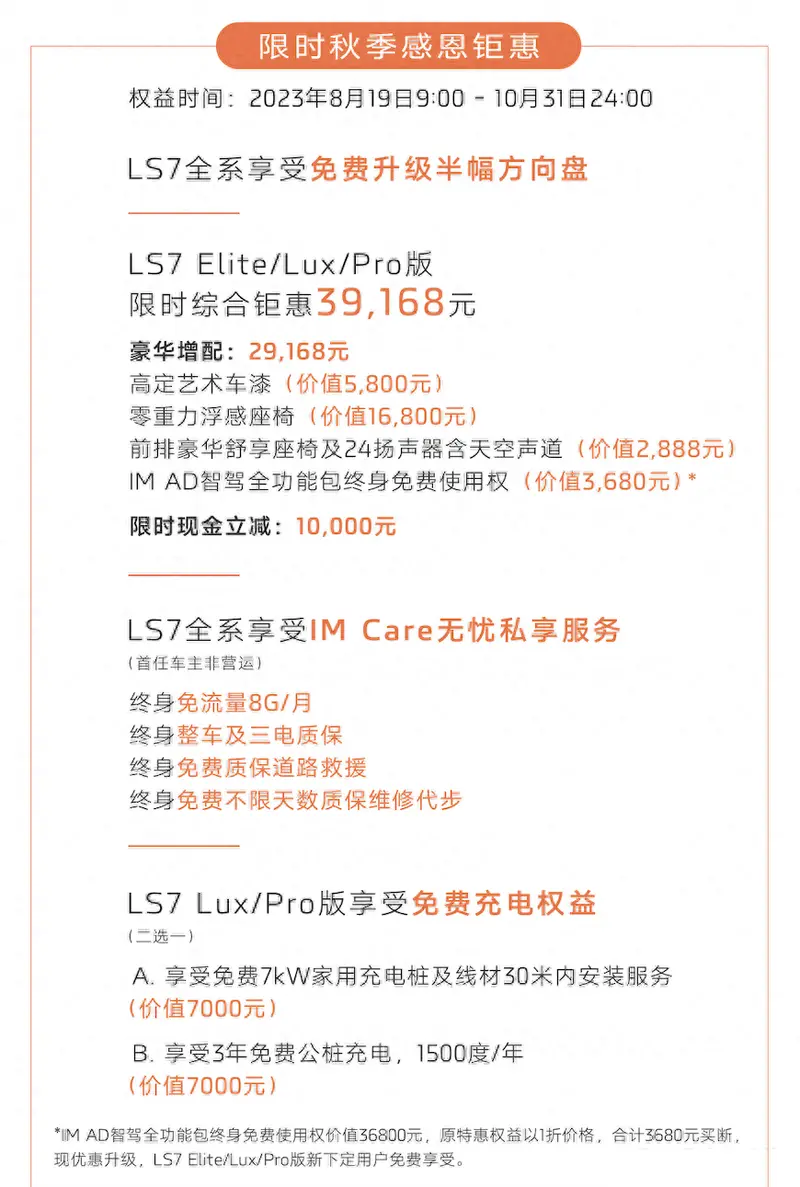 官方表示,即日起,登录IM智己APP或小程序下定智己LS7,享秋季感恩钜惠!同时,8-9月期间,新用户到店试驾智己LS7即可抽取盲盒,赢度假酒店通兑券、户外露营装备等好礼。