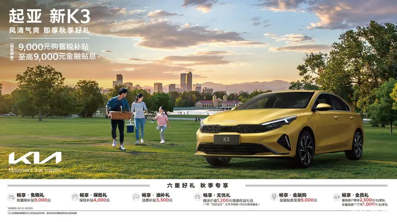 消费者购买新K3可享“免税礼、保险礼、油补礼、无忧礼、金融购、全员礼”六重好礼,分别提供了9000元购置税补贴、4000元保险补贴、5500元油费补贴、价值1200元增值权益礼包和至高9000元金融贴息、以及2500元/台置换津贴(非置换购车享1000元/台津贴)福利。
