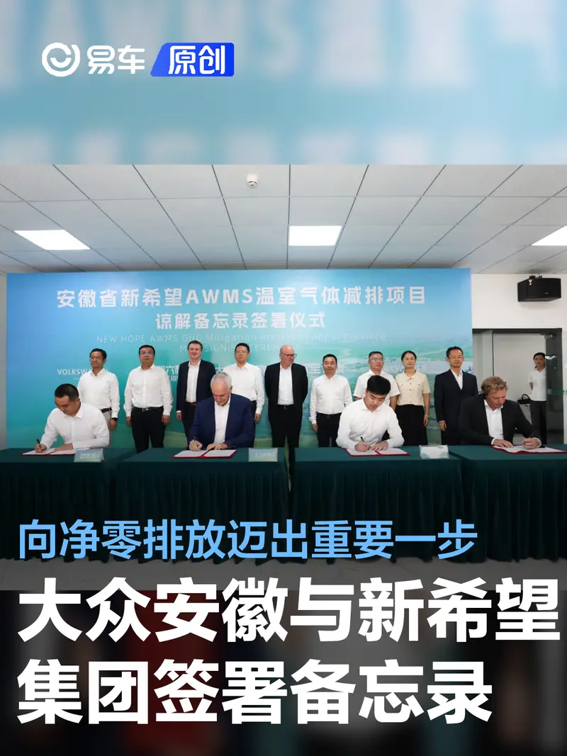 易车讯 9月7日,安徽省新希望AWMS温室气体减排项目谅解备忘录正式签署,大众安徽在实现“净零排放”生产的道路上迈出了重要的一步。该项目是大众安徽与新希望集团、大众能源公司和大众气候伙伴的合作项目,旨在抵消汽车生产过程中不可避免的温室气体排放,是大众安徽实现环境可持续发展目标的关键里程碑。通过这一举措,大众安徽将进一步实现生产净零排放的目标。